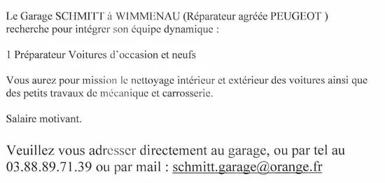 Envoyez votre CV à : kleinmotors67@gmail.com ou présentez vous directement au garage au 2 rue de Phalsbours à Drulingen.
